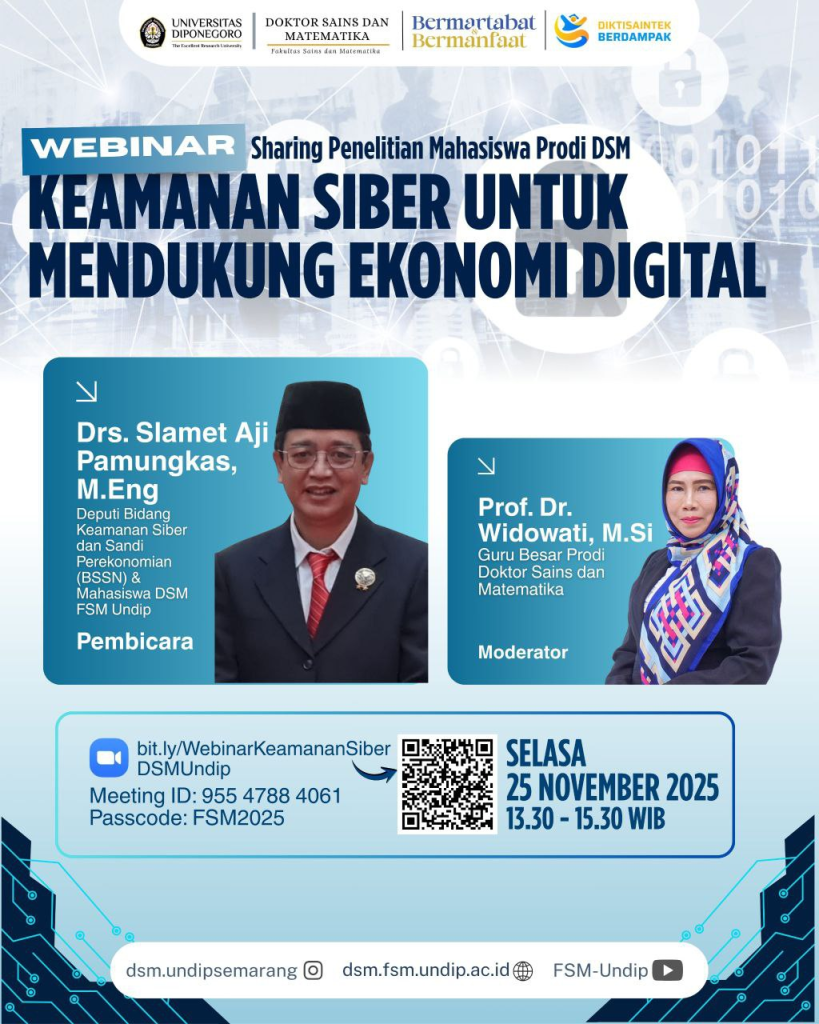 Dalam webinar ini, hadir sebagai pembicara Drs. Slamet Aji Pamungkas, M.Eng, yang saat ini menjabat sebagai Deputi Bidang Keamanan Siber dan Sandi Perekonomian (BSSN) sekaligus mahasiswa Program Doktor Sains dan Matematika FSM Undip. Beliau akan membagikan pengalaman dan hasil risetnya terkait strategi, tantangan, serta inovasi dalam bidang keamanan siber untuk mendukung perekonomian nasional berbasis digital.